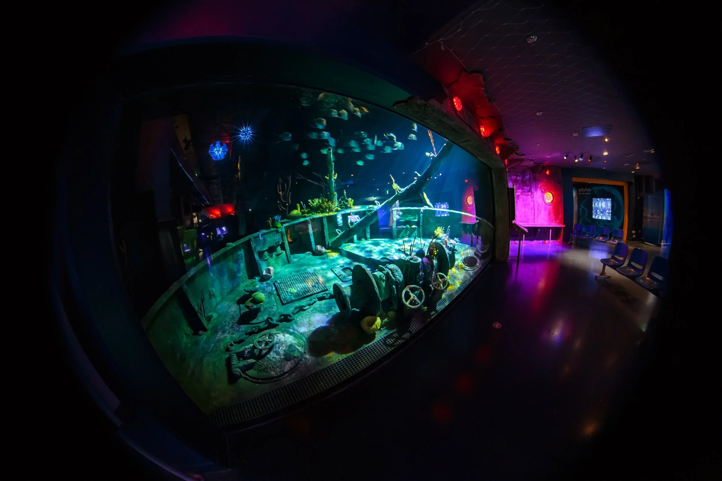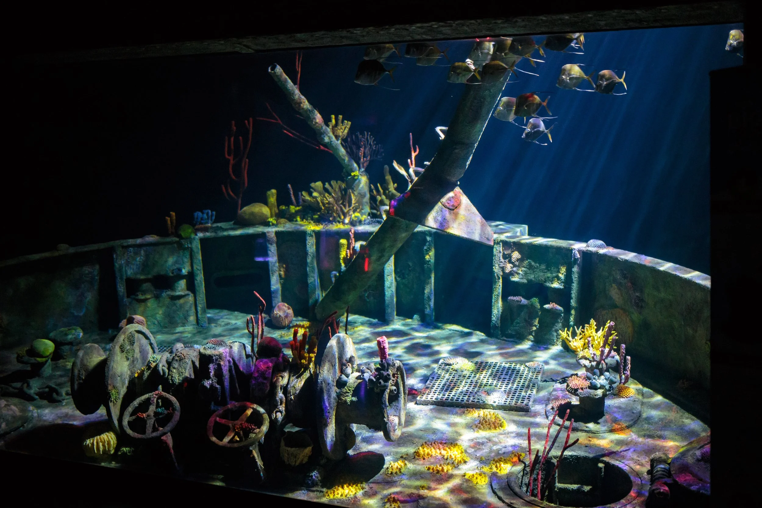 · In-Tank: The Sunken Bow Visitors look through the viewing window at a submersed replica of the USS Kittiwake. The scene is populated with large-scale themed props, including a massive winding winch, access hatches, and bollards, all covered in 15 years' worth of simulated coral growth and calcification.